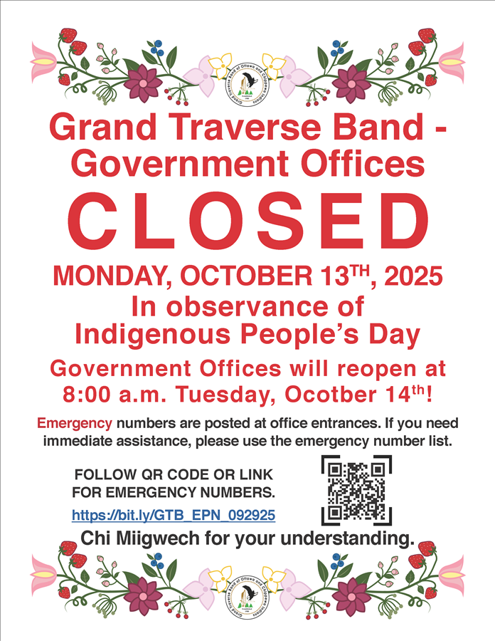 GTB Government Offices Closed Monday, October 13th, 2025 In observance of Indigenous People’s Day Government Offices will reopen at 8:00 a.m. Tuesday, Ocotber 14th!