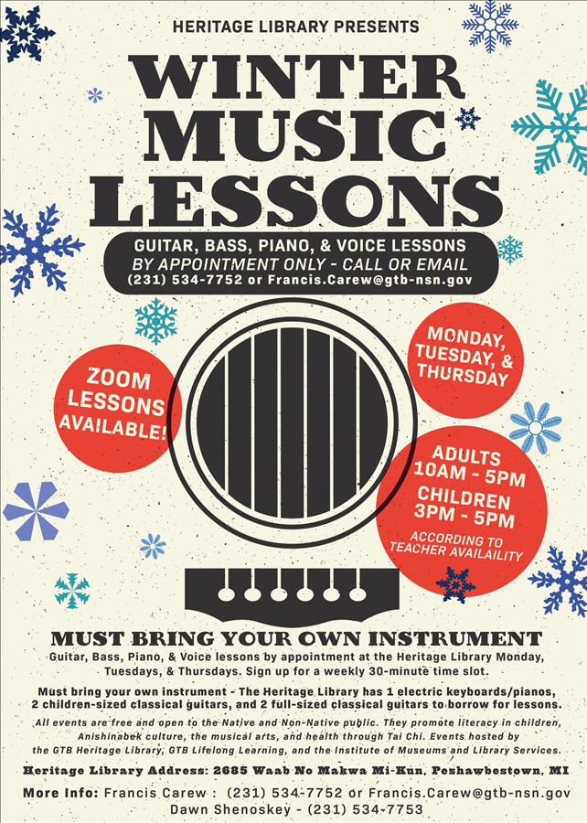 30-Minute Guitar, Bass, Piano, and Voice lessons by appointment Only - Call or Email (231) 534-7752 or francis.carew@gtb-nsn.gov to reserve your spot & for more information.