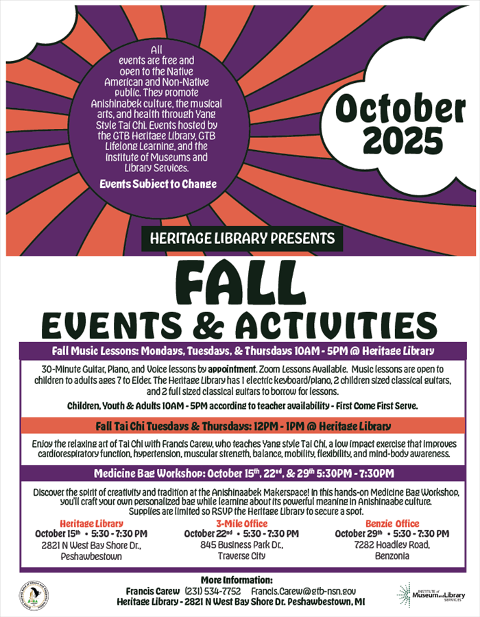 All Heritage Library events are free and open to the Native American and Non-Native public. They promote Anishinabek culture, the musical arts, and health through Yang Style Tai Chi. Events hosted by the GTB Heritage Library, GTB Lifelong Learning, and the Institute of Museums and Library Services.