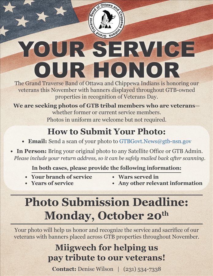 The Grand Traverse Band of Ottawa and Chippewa Indians is honoring our veterans this November with banners displayed throughout GTB-owned properties in recognition of Veterans Day. We are seeking photos of GTB tribal members who are veterans, whether former or current service members. Photos in uniform are welcome but not required.