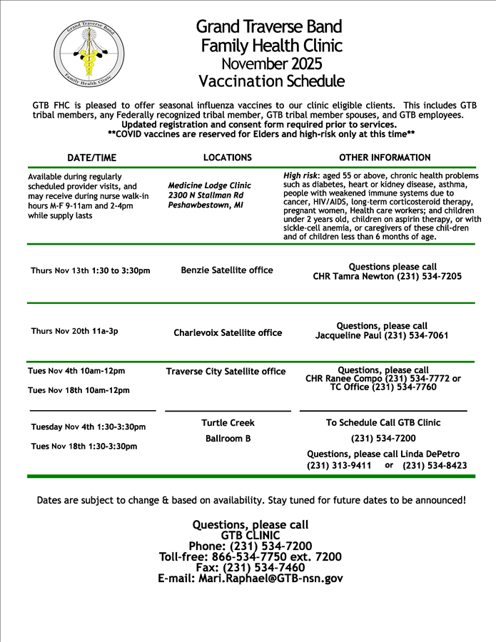 GTB FHC is pleased to offer seasonal influenza vaccines to our clinic eligible clients. This includes GTB tribal members, any Federally recognized tribal member, GTB tribal member spouses, and GTB employees.