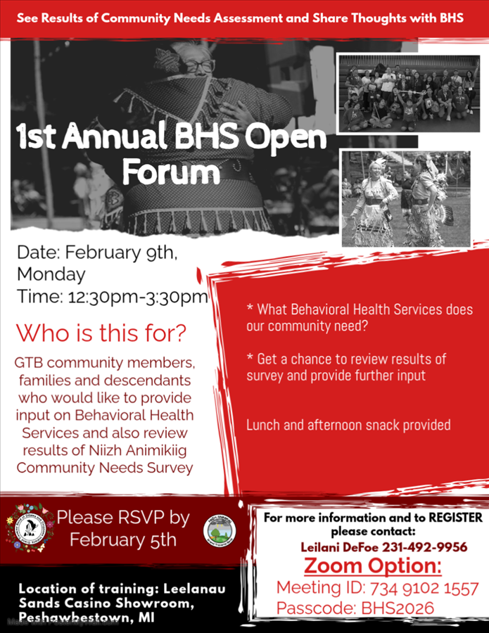 GTB community members, families and descendants who would like to provide input on Behavioral Health Services and also review results of Niizh Animikiig Community Needs Survey