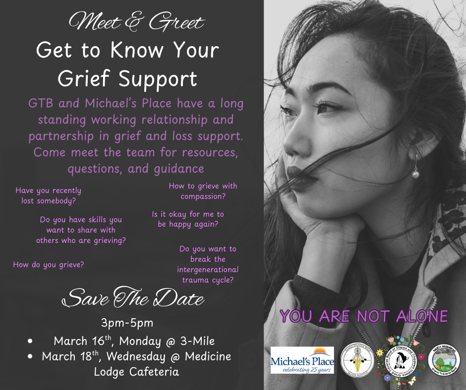 GTB and Michael's Place have a long-standing working relationship and partnership in grief and loss support. Come meet the team for resources, questions, and guidance. Have you recently lost somebody? Do you have skills you want to share with others who are grieving? How do you grieve? How to grieve with compassion? Is it okay for me to be happy again? Do you want to break the intergenerational trauma cycle?